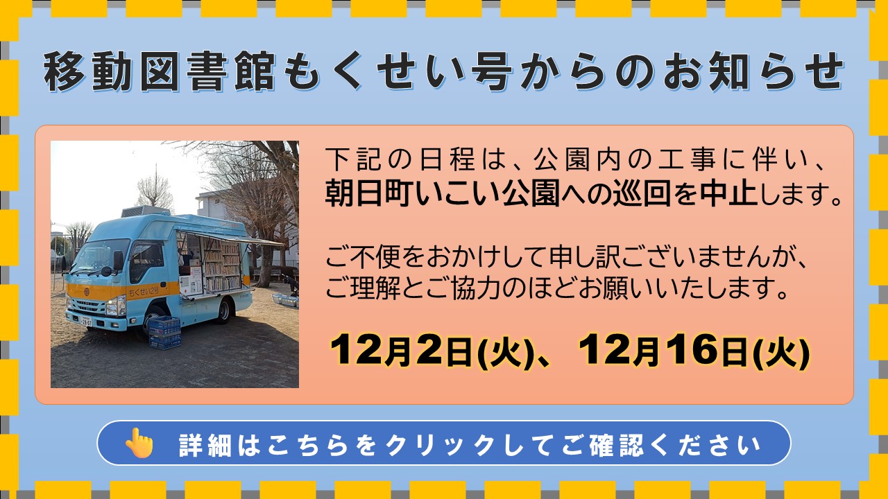 *移動図書館車もくせい号* 朝日町いこい公園の巡回について