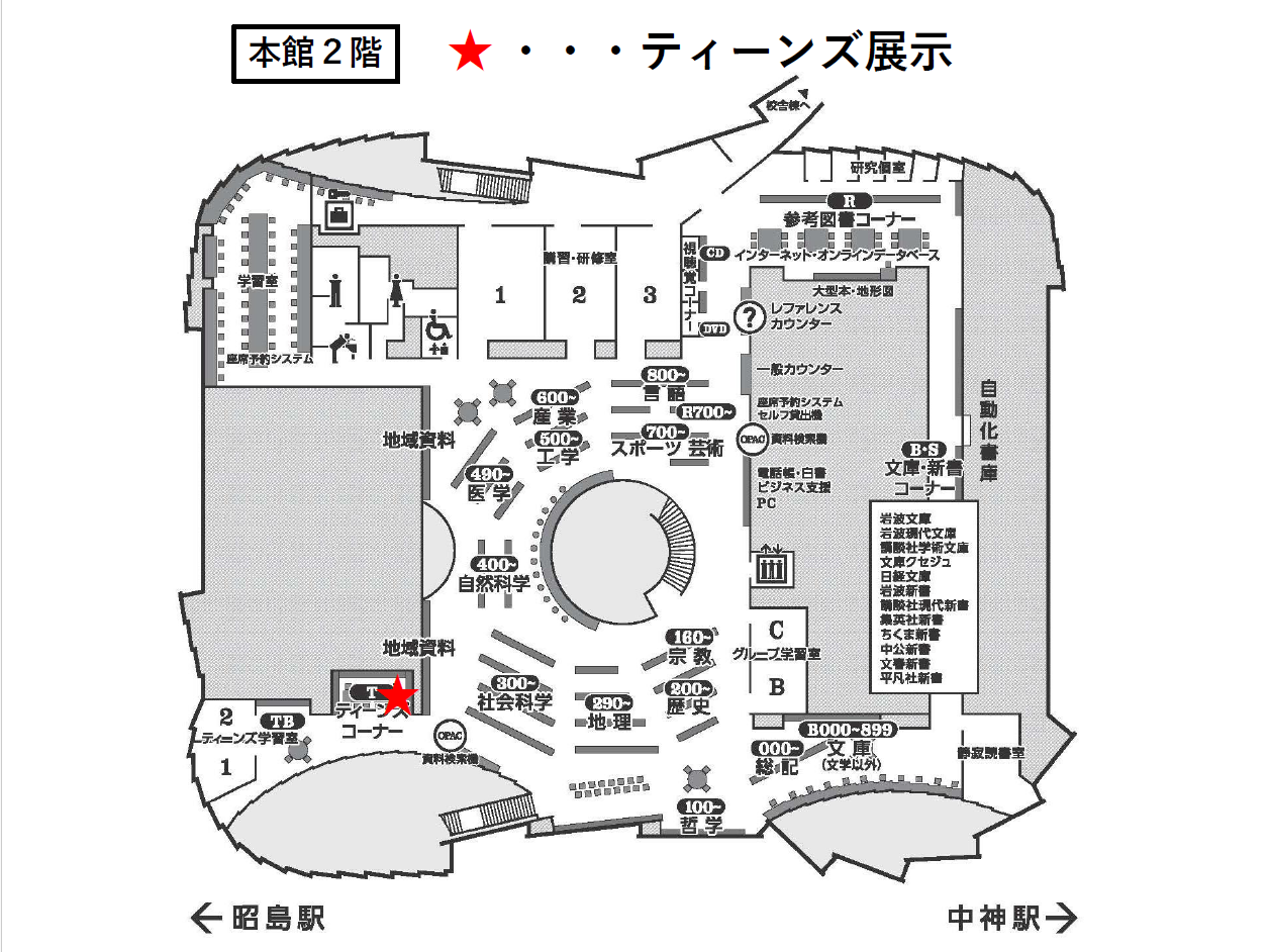 2階ティーンズコーナーにて本の展示と、パンフレットの配布をしています。